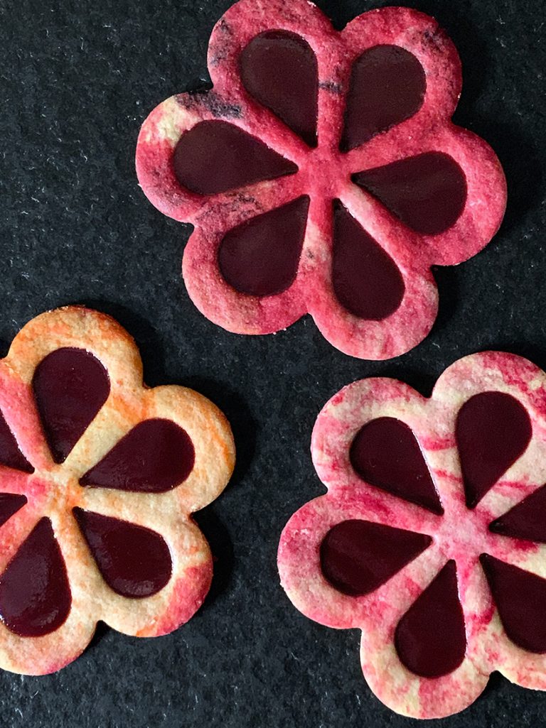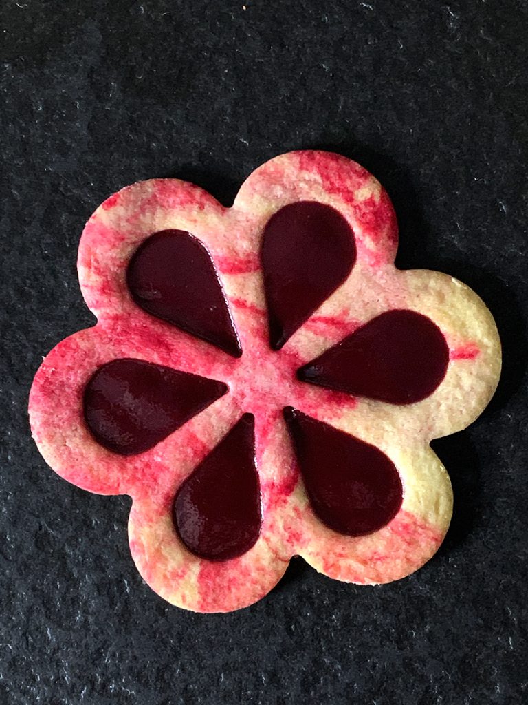 La recette est celle de biscuits au beurre (ici) et la gelée de framboises à la pectine est inventée!